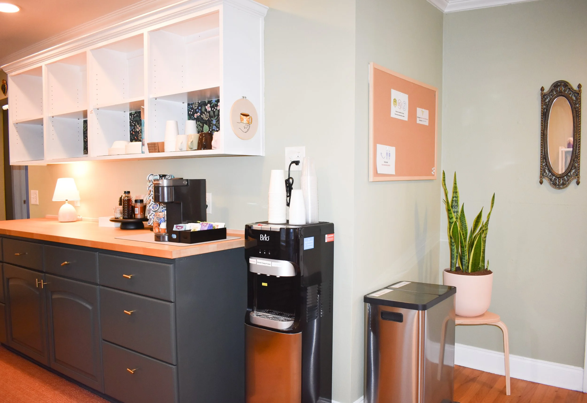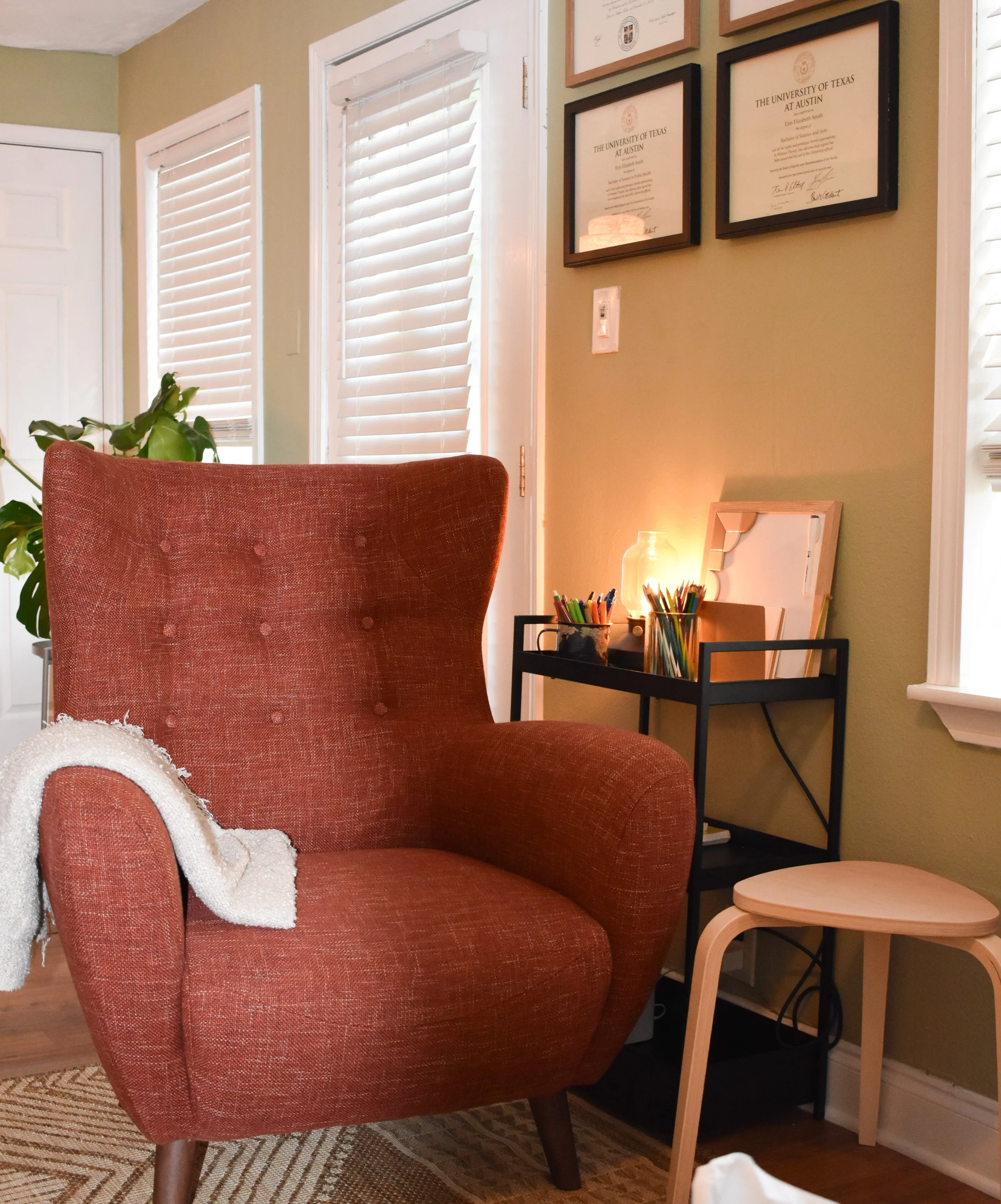 Fully furnished office space available in North-Central Austin. Join a community of therapists and mental health professionals practicing alongside each other in our warm & welcoming space. Monthly collective memberships available for 25hr/week or 5hr/week dedicated office use.
